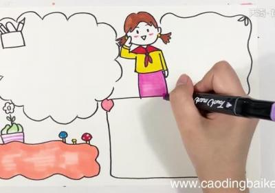 发布时间:4小时前1.首先画一个边框,边框上画一株小花和一些小蘑菇,在右边也画一个爱心装饰的边框;2.然后边框上画一个敬礼的小女孩;3.再在小女孩两边分别画上一个花朵边框和波浪形边框,画一个笔筒;4.最后为人物、装饰物和边框涂上相应的颜色并画上横线即可 。【...