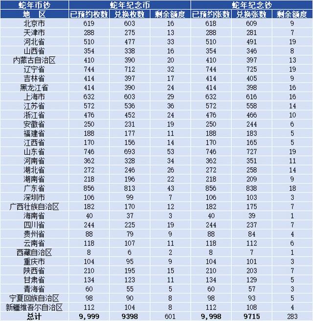 10元蛇币和20元蛇钞火热发行,吸引了众多藏友前来预约! 如今这套币钞的首次预约已经完全结束,不少藏友想要知道,是否还有更多预约机会。 这里要告诉大家,在部分地区的发行公告中,就已经确定,蛇年币钞还有第二次预约,每人都能再预约1次。 更为关键的是,和蛇年币钞一起开约的,还有京剧旦角币和东北虎豹国家公园纪念币,它们也还有不少额度! 到时候,我们每人能预约60枚纪念币,还有10张纪念钞。 那么各地额度还有多少,要如何预约,我们一起来看看。 蛇年币钞2次预约在首次预约中,蛇年币钞均出现了秒光的情况,很多藏友没有约到。 不过好消息是,在部分地区的公告中,就已经明确,这套币钞会有余量兑换,也就是第2次预约。 同时,这几年所有发行的纪念币和纪念钞,也都开展了第2次预约。 蛇年币钞会在年后再进行1次预约。 目前,首次预约兑换进度已经公布,各地的余量就是下一次预约的额度。 其中蛇币还剩下601万枚,蛇钞还剩下283万张。 根据过往的安排,每人能约20枚蛇币和10张蛇钞。 京剧旦角币额度公布除了蛇年币钞之外,还有京剧旦角币和东北虎豹国家公园纪念币,同样在等待二次预约。 按照惯例,这2枚纪念币将和蛇年币钞一起进行二次预约。 这么多能一起约吗?其实在2022年的时候,就有5枚纪念币和2张纪念钞,一起开展了第二次预约。 京剧旦角纪念币,同样是非常火热的新币,只发行6000万枚,预约也是秒光。 这枚5元的纪念币,也有不少人在期待2次预约。 那么,它还有多少额度呢? 旦角币7天兑换数据已经公布,各地额度如下: 可以看到,旦角币剩下了388万枚,比蛇币要少。www.ws46.com 不过全国各地都有不少余量,到时候我们每人依然能预约20枚。 虎豹纪念币额度公布东北虎豹国家公园纪念币同样发行了6000万枚,由于缩量发行的原因,它在预约时也受到了藏友的热捧,预约进度达到百分百。 依然有部分藏友没有约到。 不过它在开始兑换后,市价出现了较大幅度的下滑,兑换进度也要低不少。 各地的2次预约额度,同样已经整理好了。 虎豹币一共剩下了584万枚! 各地的预约额度,都要明显多上一些。到时候,我们每人还能预约20枚虎豹币。 要如何预约?虎豹币、旦角币和蛇年币钞,预计将在年后2月到4月之间,一起开展第2次预约。 它们具体该如何预约呢? 从过去的安排来看,热门币钞将采用线上预约,面值附近的币钞,会直接采用线下兑换。 因此,旦角币和蛇年币钞将会是线上预约,虎豹币很可能是线下预约! 3种纪念币每人每种能约20枚,一共是60枚。蛇钞每人能约10张。 具体公告发布后,百科网会及时通知大家。 |