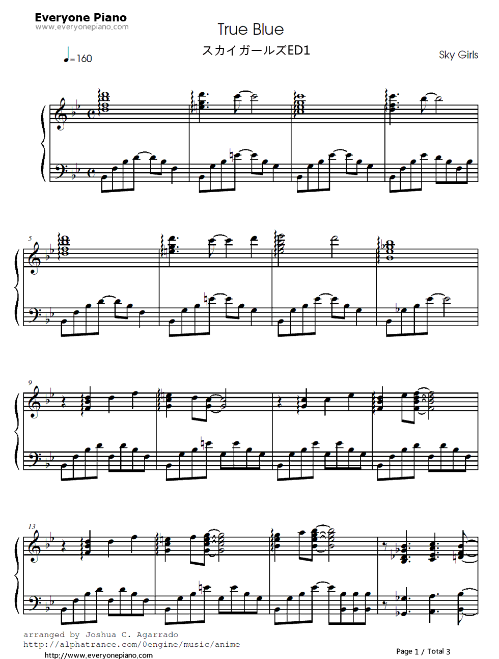 是电视动画《天翔少女》的片尾曲。天翔少女(日文名:スカイガールズ,英文名:SKY GIRLS)跟同公司KONAMI的模型系列“军武娘”同样是岛田フミカネ所设计,采用了机械加上少女(兵器娘)的路线。属于军武娘的动画化路线,接(jìn)武装神姬的设计。这一部是岛田フミカネ第一部动画化的作品。 True Blue此曲是由后藤沙绪里演唱的。后藤沙绪里,日本女性声优,神奈川县横滨市出身,所属事务所为81 PRODUCE。代表作品有:《大正野球娘》菊坂胡蝶、《银河天使》乌丸千岁、《恋恋七人组》飞鸟弥生等。 歌词下方是True Blue钢琴谱,希望大家喜欢。 True Blue歌词: 瞳閉じて 手を繋いで 連れて行くよ…Flying Highwww.ws46.com 鳥より高く 雲を越えて 上昇する 恐くないよ 光を目指して 腕を伸ばすなら 迷いや涙は捨てて (Just) believe in the Blue 約束する 君が信じたその未来を かならず この手で守る 自由な空 この世界取り戻すためにTrue Blue 誰よりも強くなれる 風を縦に 抜き去ったら 遠くなるよ 君の街も どんな悲しみも 呟いた不安も 小さく見えるよきっと (Just) melting in the Blue 約束する 今日よりも明日の太陽 まぶしく 君に射すように この心が 負けそうになった時だってTrue Blue 信じれば飛び立てるよ 雨雲の上 広がってる 汚れなき青 君と見つけた それがTrue Blue 約束する 君が信じたその未来を かならず この手で守る 約束する 今日よりも明日の太陽 まぶしく 君に射すように 自由な空 この世界取り戻すためにTrue Blue 誰よりも強くなれる 見つめていて…Forスカイガールズ |