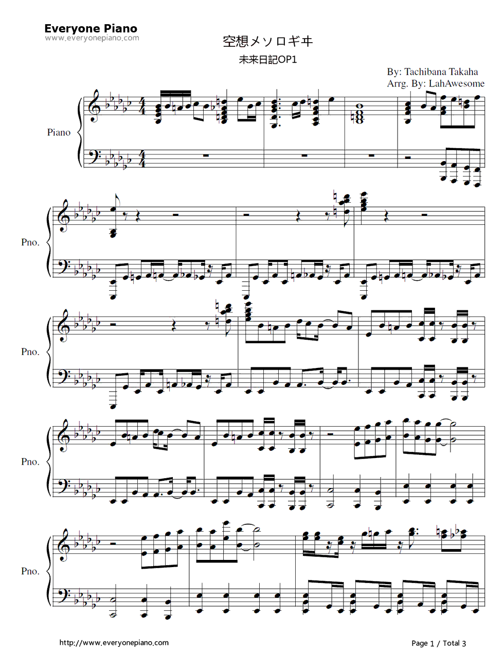 是由悬疑漫画《未来日记》改编而成的同名动画的片头曲。漫画官方于2010年3月底宣布动画化。附赠OAD的第11卷限定版原定于同年9月9日发卖,但最后延期至12月9日。影碟收录片长9分钟的短篇动画,亦同时有11分钟的映像版设定资料集。短篇动画以宣传和预告性质为主,包括了雪辉参加游戏的契机和初尝挑战的场景;设定资料集则是让短篇动画的设定跟原作的设定作深入介绍和比较。其他附赠物品亦包括平山英嗣绘画的影碟封套和4页小册子。 除了正传故事外,正式动画版亦在片尾曲后追加C部份的短篇动画环节姆鲁姆鲁老师的里未来日记,以原作单行本结尾附赠作蓝本去改篇及原创,主要是关于姆鲁姆鲁送出未来日记和遇上主要配角的各种趣事。部分集数因播放时间不足而留待影碟发布,制作人员名单亦和正传有所分离。 另外,空想メソロギヰ此曲由妖精帝国演唱。妖精「ゆい」与「橘尭叶」组成的『妖精帝国第参军楽队』、简称为『妖精帝国』,现与召集的「Nanami」「紫炼」「Gight」3位成员在日本展开音乐活动。以摇滚、重金属为基础,融合古典、哥特、科技式电子乐等多元素创作出激烈且极具侵略性的摇滚乐。 歌词下方是空想メソロギヰ钢琴谱,希望大家喜欢。 空想メソロギヰ歌词: 微睡(まどろ)みの淵で目蓋に揺蕩う 夢想の神は優雅に微笑み死を降し 時空を総べる因果の鎖は絡み出す 神の与えし空想 Program さぁ eins zwei drei! 重なり合う さぁ eins zwei drei! 死を躱して 消滅の遊戯に焦がれる奇跡を奪う Survivalgame 螺旋のように(www.wS46.com) 泡沫の未来書き換えるように 空想繋ぐ輪廻のノイズが鳴り渡る 時間は歪み因果の旋律は崩れ去る 神の与えし継承 Program さぁ eins zwei drei! 連なり合う さぁ eins zwei drei! 死を振り切って 消滅の遊戯に抗う奇跡に挑む Erasergame 夢幻のように 神の与えし機械(からくり) Program さぁ eins zwei drei! 重なり合う さぁ eins zwei drei! 死を躱して eins zwei drei! 連なり合う さぁ eins zwei drei! 死を振り切って 消滅の遊戯に焦がれる奇跡を奪う Survivalgame 螺旋のように 哀憐(あいれん)なる傍観者 焦がれる生死よりも遠く 最果てにある箱庭で 終わりのない奇跡があると 信じていた |