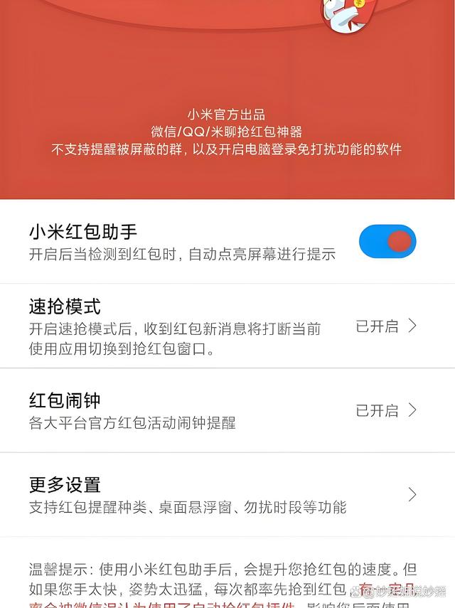 一、OPPO手机 首先,点一下手机桌面上的“设置”图标,进入设置页面后,用手指往上滑屏幕,找到“系统设置”选项并点开。在这个页面里,你能看到“红包助手”功能,点击进去,你会发现它默认是关着的,把开关打开,让红包助手 “苏醒”过来。然后,下面还有“红包提示铃声”和“自动跳转至红包聊天页面”两个选项,也一起打开。这样,当有红包来的时候,手机不仅会及时提醒你,还能自动带你直接到抢红包的地方,是不是特别贴心? 二、小米手机 先打开手机里的“安全中心”,然后往上滑屏幕,在下面找到“红包助手”并点击开启。接着,打开下面的“速抢模式”,这个功能能让你抢红包更快,领先一步。还有个很实用的“红包闹钟”,开启后,每当有官方红包活动时,它会自动提醒你,再也不怕错过任何薅羊毛的机会。 无论你使用什么品牌的手机,还有一个关键的通用设置不能忘,那就是微信的新消息通知。打开微信,点击右下角的“我”,进入设置,找到“新消息通知”,把“接收新消息通知”“接收语音视频通话提醒”以及“显示消息详情” 这三个选项通通开启。这一步就像是给抢红包之路打通了任督二脉,只有这样,手机自带的抢红包助手才能及时捕捉到红包信息,顺畅地为你服务。要是这几个开关没打开,红包助手就算检测到红包,微信也没法及时弹出提醒,那可就白忙活一场了。 不过,在开心抢红包的同时,大家也要注意一些小细节。千万别仗着有抢红包助手就肆无忌惮,要是每次都率先抢到红包,而且频率过高,有一定几率会被误判为使用了自动抢红包插件,导致账号受罚,那可就得不偿失了。所以,偶尔佛系一下,给别人也留几个红包,细水长流才是抢红包的长久之道。毕竟,抢红包只是节日里的一个小乐趣,可别让它变成了负担,或是破坏了和亲友互动的好心情。 要是今天文章对您有帮助,希望大家可以把它转发分享出去,点一个赞,感谢您的支持。 |