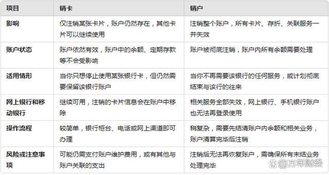 销卡和销户是处理银行卡的两种常见方式,它们适用于不同的情境,且各自的影响和操作流程也有所不同。选择销卡还是销户,取决于你的需求、银行账户的使用情况,以及对财务管理的考虑。下面是对两者的详细对比分析,以帮助你做出适合的选择。 一、销卡与销户的定义 1. 销卡 销卡是指注销某一张特定银行卡(通常指借记卡或信用卡),但该卡所对应的银行账户仍然保留。销卡后,虽然这张卡无法继续使用,但你的银行账户依然存在,并且你可以使用同一账户下的其他银行卡。 2. 销户 销户是指注销整个银行账户,意味着所有与该账户相关的银行卡、存折、网上银行等服务都会一并终止。销户后,该账户不再存在,你无法再通过任何方式访问或使用该账户里的资金和相关服务。 二、销卡和销户的区别 三、销卡适用的情况 销卡适用于你只想注销某一张特定银行卡,但仍然希望保留该银行的账户。通常在以下几种情况下,销卡是更适合的选择: 1. 不用某张银行卡,但其他服务仍需使用 多个卡片管理繁琐:如果你持有多张同一家银行的银行卡,但只希望注销其中一张,销卡是最好的选择。 保留网上银行服务:即使你不再需要某张银行卡,但仍希望使用该银行的网上银行或手机银行服务,可以销卡而不是销户。 账户内有定期存款或其他理财产品:如果账户内有未到期的存款、理财产品,销卡可以避免影响这些资金的管理。 信用卡只想取消特定卡种:如果你有多张信用卡,但不想使用其中的一张,比如年费较高的高端卡,销卡比销户更方便。 2. 银行卡损坏或丢失 如果你的银行卡损坏、失磁或丢失,可以选择销卡并重新申请一张新卡。这样账户信息和余额不会受到影响。 3. 账户仍有使用价值 例如,你在该银行的账户绑定了常用的支付服务(如支付宝、微信等),销卡后仍可以使用其他卡或账户功能。 4. 避免账户冻结或睡眠账户的费用 如果银行规定每个账户必须有一定的资金活动,你可以通过销掉不常用的卡来避免可能的账户管理费用。 四、销户适用的情况 销户适用于你不再需要该银行的任何服务,或者想彻底关闭该账户与该银行终止所有关系。以下几种情况适合销户: 1. 不再需要该银行账户 减少多余账户:如果你有多个银行账户,但只经常使用其中的几个,销户可以减少不必要的账户数量,方便管理财务。 终止与银行的关系:你不打算继续与该银行有业务往来,可以选择销户,完全清空账户信息。 账户闲置多年:如果账户长期不使用,且没有任何存款或关联业务,你可以选择销户以免账户被自动冻结,或者避免出现“睡眠账户”的管理费。 2. 避免年费或其他费用 有些银行的账户有管理费用,如年费或账户维护费,尤其是高端卡种。如果你不想继续支付这些费用,销户可以一次性彻底解决。 3. 信用卡账户销户 避免年费:如果你的信用卡账户有高额年费或者你不再使用该信用卡,销户可以帮助你彻底避免这些费用,防止因为忘记缴纳年费而产生不必要的信用损失。 4. 更换主要银行 当你决定把主要的银行往来转移到另一家银行时,销户可以避免不必要的账户留存问题。这样也能防止长期不使用账户而产生费用。 五、销卡和销户的操作流程 1. 销卡流程 联系银行:你可以通过银行的客服热线、网上银行、手机银行或亲自前往银行网点,申请注销指定的银行卡。 确认身份信息:银行会要求你提供身份证明,确认你是卡片的持有人。 处理余额:如果卡片上有余额,银行可能会将余额转入你在该行的其他卡片或账户中。 确认销卡成功:一旦销卡完成,银行会向你确认该卡片已失效,不再能够使用。 2. 销户流程 账户清算:在办理销户前,需确保账户内没有任何余额或未结清的业务(如定期存款、贷款、信用卡账单等)。 携带有效证件:前往银行网点办理销户,通常需要身份证、银行卡等信息。部分银行也支持在线申请销户,但需要邮寄材料或线上认证。 处理账户余额:如果账户内有余额,可以取现或转账到其他账户。账户内的定期存款或理财产品需要提前终止或转移。 确认销户成功:银行会确认你的账户已成功销户,并提供相关证明文件。网上银行、手机银行、银行卡等一并失效。 六、销卡和销户的注意事项 1. 检查账户是否有未结业务 在销卡或销户前,确保账户内没有未清账单、定期存款、贷款或未结算的支付业务。如果账户中有挂钩的金融产品,销户前可能需要提前赎回或结算。 2. 更新绑定的第三方服务 如果你的银行卡与支付平台、自动扣费服务等绑定,注销卡片或账户后需要及时更新这些信息,以免影响日常支付。 3. 核对账户余额 确保在销户前已取出账户余额,避免销户后资金冻结或无法取回的情况。 4. 信用记录影响 信用卡账户销户时,需确保所有账单已结清,避免因未结算账单导致信用记录受损。 七、总结 销卡适合那些不再使用某张卡片,但仍需保留该银行账户的用户,通常操作较为简便,且对账户内的余额和业务影响较小。 销户则适合那些打算彻底结束与银行的关系,或者不再需要该银行的任何服务,操作相对复杂,需要提前结算账户内的余额和未结业务。 根据你的需求,选择销卡或销户要考虑到账户的使用频率、资金管理和后续财务规划。 |