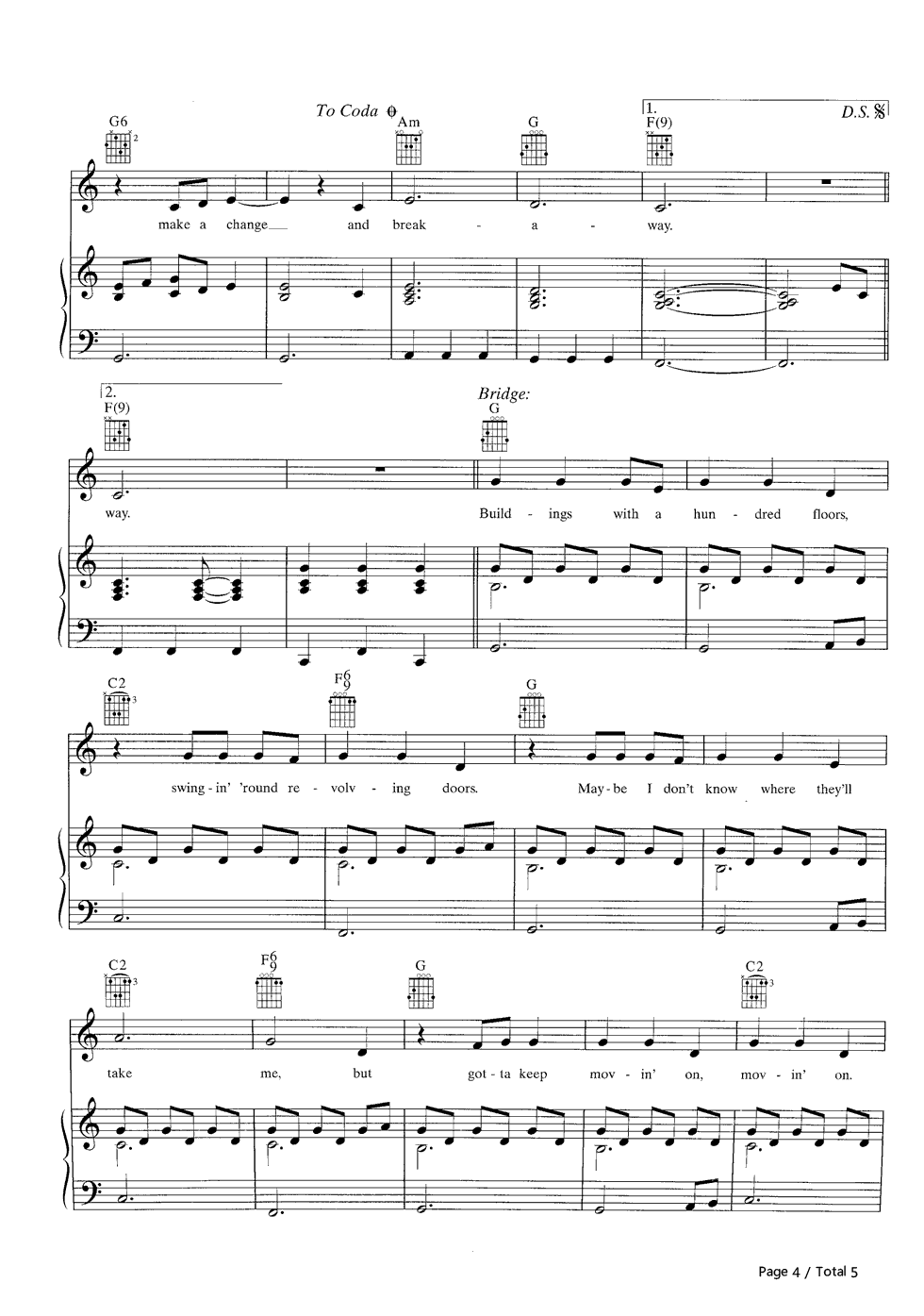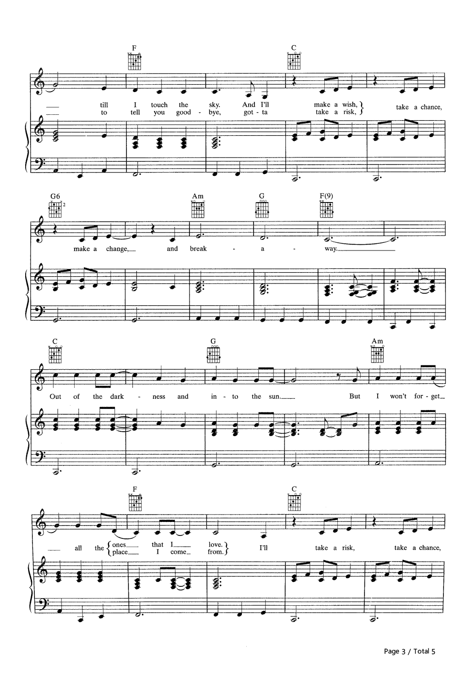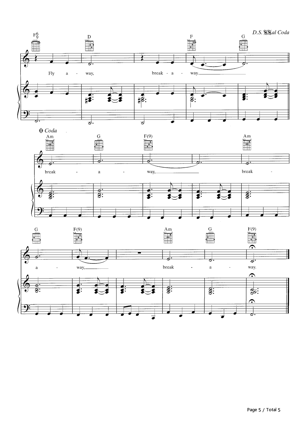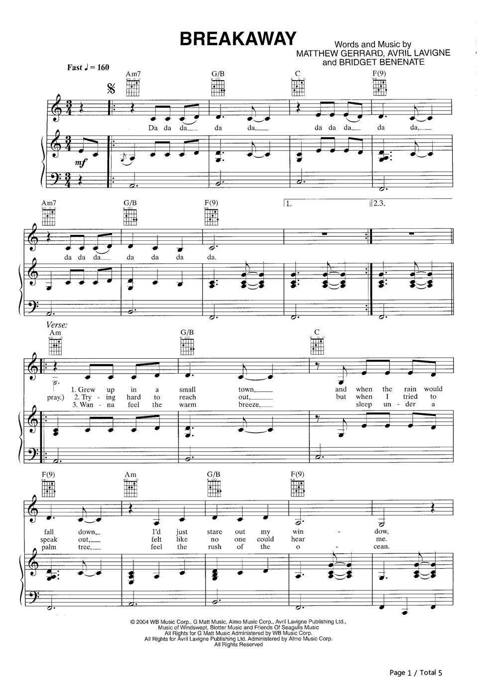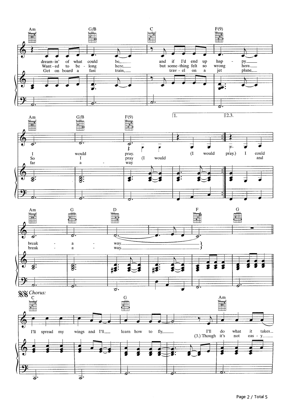 出自Kelly Clarkson的第二张录音室专辑《Breakaway》。是专辑的首支单曲,单曲于2004年7月20号发行。单曲由著名歌手Avril Lavigne为其创作。歌曲还是好莱坞电影《皇室日记2:麻雀变凤凰》的一首插曲。单曲最高全美排名第6。 而该专辑发行于2004年11月30号。专辑首周在美国Billboard榜上拿下第三,累计认证六白金。这张专辑也成为Kelly全球范围内最成功的一张专辑。 歌词下方是Breakaway钢琴谱,希望大家喜欢。 Breakaway歌词: Grew up in a small town在一个小镇成长 And when the rain would fall down每当大雨迷茫 I"d just stared out my window我只是向窗外凝望 Dreaming of what could-be梦想着我的梦想 And if I"d end up happy如果我能快乐死亡 I would pray (I would pray)我将会祈祷(我将会祈祷) Trying hard to reach out尝试着接触外面的世界 But when I"d try to speak out但当我想要倾诉 Felt like no one could hear me却感到茫然无助 Wanted to belong here想要归属这儿 But something felt so wrong here但又总是充满了疑惑 So I pray (I would pray)所以我祈祷(我将会祈祷) I could breakaway我将要远走他乡 I"ll spread my wings and I"ll learn how to fly我将展开翅膀,我将学习飞翔 I"ll do what it takes til" I touch the sky我将努力直到我接触天涯 I"ll make a wish我将许下心愿 Take a chance尝试一下 Make a change奋斗一回 And breakaway远走他乡 Out of the darkness and into the sun脱离黑暗,冲向光明 But I won"t forget all the ones that Iloved但我不会忘记我所深爱之物 I"ll take a risk我将独自冒险 Take a chance尝试一下 Make a change奋斗一回 And breakaway远走他乡 Want to feel the warm breeze想要吹着暖风 Sleep under a palm tree睡在棕榈树下 Feel the rush of the ocean感受海浪拍击 Get on board a fast train搭上一辆快车 Travel on a jet plane, far away (I will)登上一架飞机,展翅高飞(我将) And breakaway远走他乡 I"ll spread my wings and I"ll learn how tofly我将展开翅膀,我将学习飞翔 I"ll do what it takes til" I touch the sky我将努力直到我接触天涯 I"ll make a wish我将许下心愿 Take a chance尝试一下 Make a change奋斗一回 And breakaway远走他乡 Out of the darkness and into the sun脱离黑暗,冲向光明 But I won"t forget all the ones that I loved但我不会忘记我所深爱之物 I"ll take a risk我将独自冒险 Take a chance尝试一下 Make a change奋斗一回 And breakaway远走他乡 Buildings with a hundred floors种满百花的大楼 Swinging around revolving doors随着旋转门摇摆 Maybe I don"t know where they"ll take me but我并不知道将去往何方,但 Gotta keep moving on, moving on我必须一直向前,努力奋斗 Fly away, breakaway展翅高飞,远走他乡 I"ll spread my wings我展开翅膀 And I"ll learn how to fly学习飞翔 Though it"s not easy to tell you goodbye虽然多么难以向你说声再见 I gotta take a risk但我必须冒险 Take chance尝试一下 Make a change奋斗一回 And breakaway远走他乡 Out of the darkness and into the sun脱离黑暗,冲向光明 But I won"t forget the place I come from但我不会忘记我来自何方 I gotta take a risk但我必须冒险 Take a chance尝试一下 Make a change奋斗一回 And breakaway, breakaway, breakaway远走他乡…… |