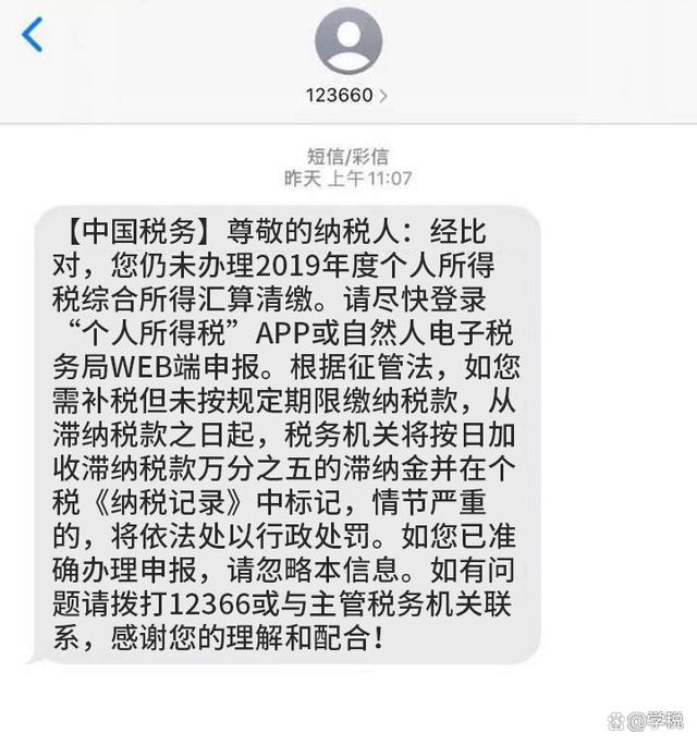 对于经提醒仍不办理或者更正申报的纳税人,可能会进行立案调查,届时轻则需要补税,缴纳滞纳金,重则叠加少缴税款0.5-5倍的罚款,以及影响个人纳税信用。 2、如果大家有收到这样的消息,请务必重视。 首先,需要确定提示信息是否为官方发送,然后核查是否存在提醒中所列的问题。如果经核实税务部门提醒的内容属实,则需要尽快按照规定和要求进行汇算申报。 3、作为公司的财务等相关人员,我们建议以通知提醒的方式,做成一个内部文件,发给全体员工。 4、已经有不少人因为过往年度个税汇算问题,被查被罚。经过梳理,我们发现,问题主要集中在:未在规定时间办理汇算,在办理汇算过程中进行虚假申报,存在应税收入未如实填报等。