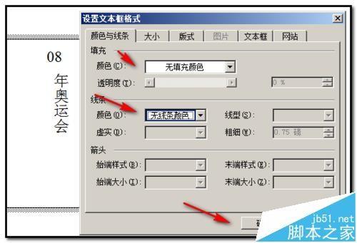 11、按步骤7和步骤8操作把竖文本框填充颜色和线条颜色都设置为无;、再点确定。
