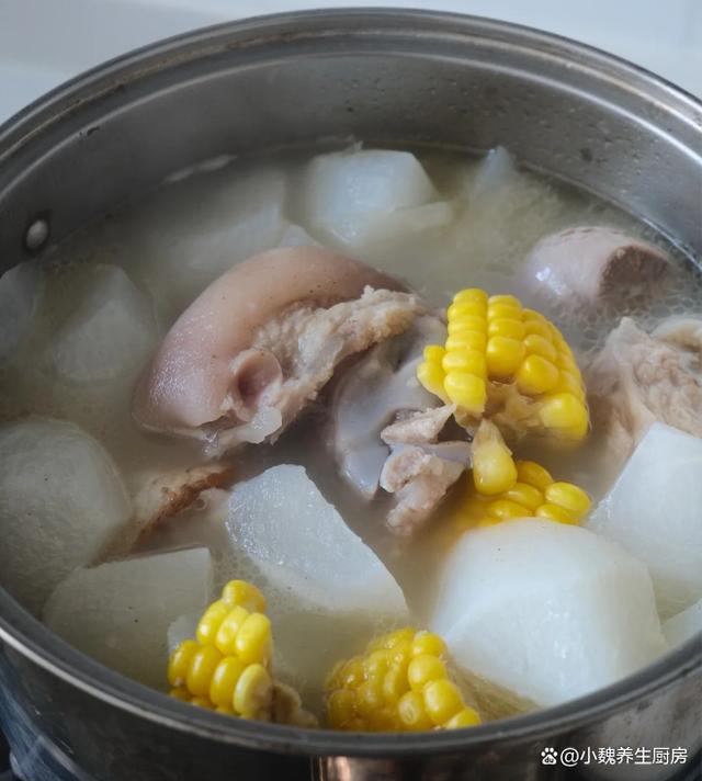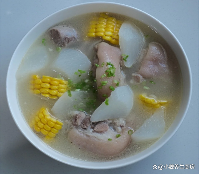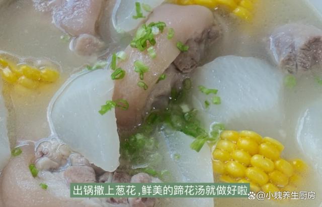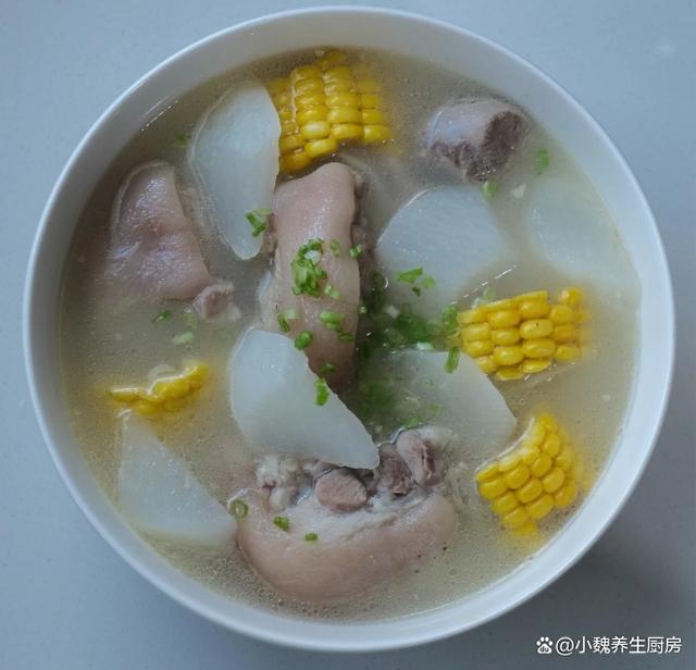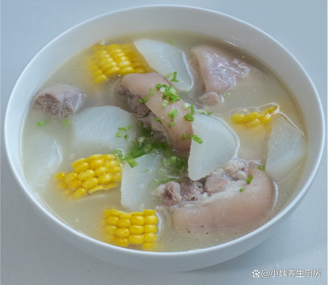 步骤6:让汤品色泽开始变色,调入一小勺白胡椒粉,最后撒上食盐,丢入葱花即可,这款玉米白萝卜炖猪蹄汤就可以食用了。 玉米白萝卜炖猪蹄汤的好处:白萝卜炖猪蹄汤的好处,远远超出了它作为一道美味佳肴的范畴。这道汤不仅融合了玉米的甘甜、白萝卜的清新与猪蹄的醇厚,更在滋养身体、强健体魄方面展现出了独特的魅力。从营养学方面来讲,猪蹄富含丰富的胶原蛋白,搭配白萝卜和玉米,简单炖一锅,猪蹄中的胶原蛋白和钙质,对于骨骼的生长和修复有着不可替代的作用,特别适合老年人和小孩食用,白萝卜会让汤品更加清甜,每周喝一碗鲜汤,能够温暖身体,驱走寒气,还能够滋补养生,提高身体的免疫力。 各位网友们,你们是否喝过这款玉米白萝卜炖猪蹄汤呢?(上述的图片都出自网络)