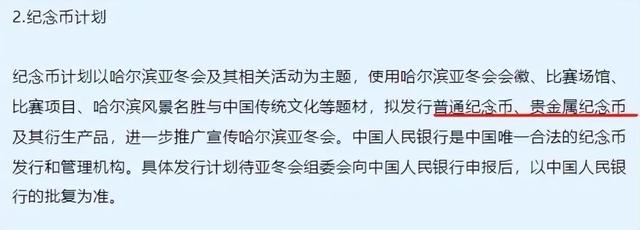 如果发行,这将是一枚面值5元的纪念币,币面会采用亚冬会的运动项目。具体设计,大致会类似于冬奥会纪念币。 由于题材不算特别重大,它的发行量也不会很多,预计是6000万枚,甚至更少。 从各种配置来看,这枚纪念币还是相当值得期待的。 什么时候预约那么,这套纪念币会在什么时候发行呢? 亚冬会已经定于明年2月举办。此类题材的纪念币,一般会提前发行。 因此,这套纪念币基本会在今年年底发布公告,预计在12月就可以预约了。 到时候无论是金银币还是普通纪念币,都值得我们期待。