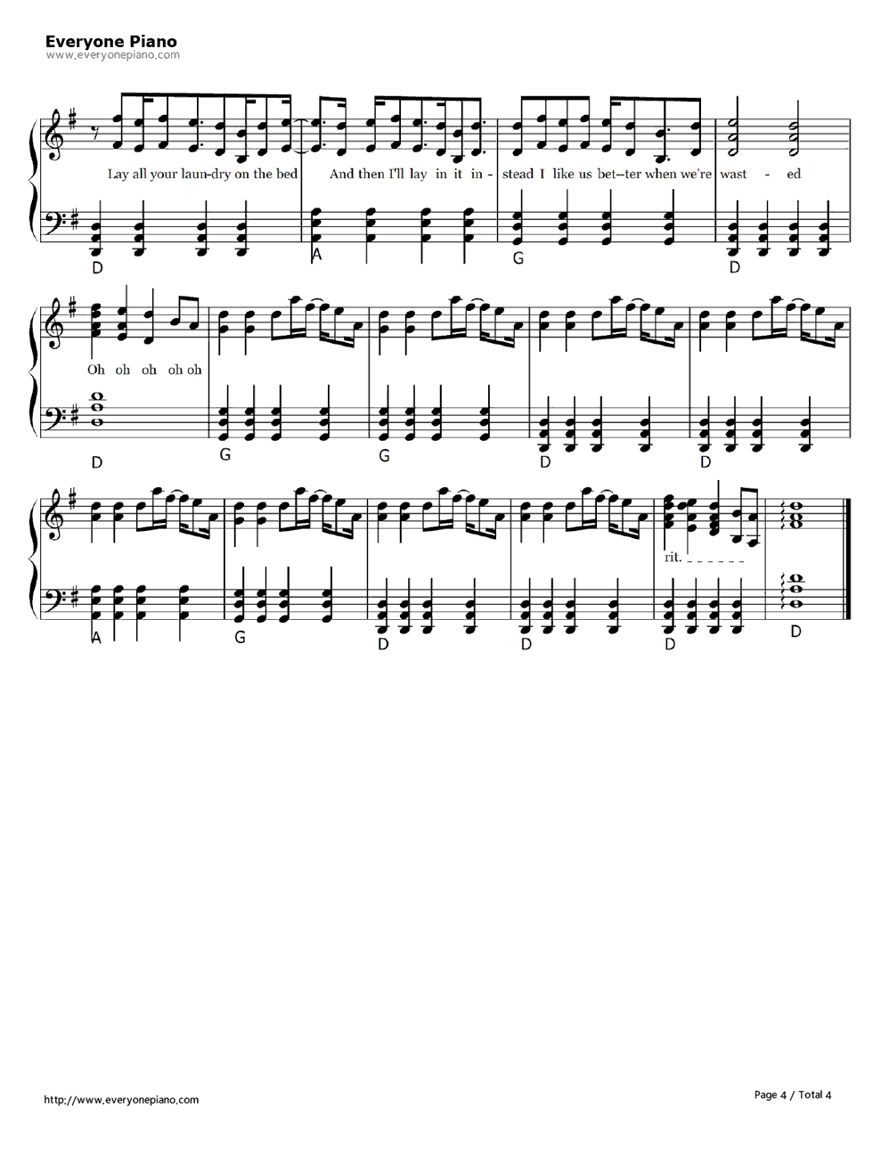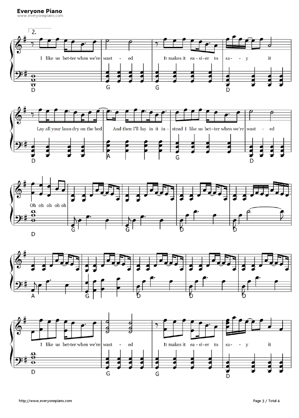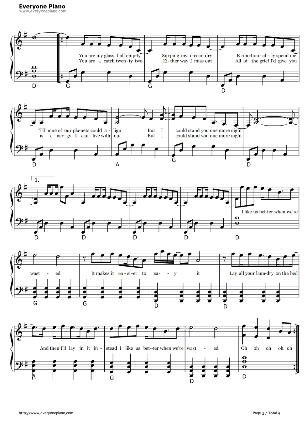 歌词下方是Wasted钢琴谱,希望大家喜欢。 (www.Ws46.com) Wasted歌词: I like us better when we"re wasted It makes it easier to fake it The only time we really talk Is when our clothes are coming off I like us better when we"re wasted It makes it easier to say it Lay all your laundry on the bed And then I"ll lay in it instead I like us better when we"re wasted Oh oh oh oh You are a glass half empty Sipping my ocean dry Emotionally spent me Til none of our planets could align But I could stand you one more night I like us better when we"re wasted It makes it easier to say it Lay all your laundry on the bed And then I"ll lay in it instead I like us better when we"re wasted Oh oh oh oh You are a catch 22 Either way I miss out All of the grief I"d give you Is energy I can live without But I could stand you one more night I like us better when we"re wasted It makes it easier to say it Lay all your laundry on the bed And then I"ll lay in it instead I like us better when we"re wasted Oh oh oh oh I like us better when we"re wasted It makes it easier to say it Lay all your laundry on the bed And then I"ll lay in it instead I like us better when we"re wasted Oh oh oh oh |