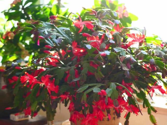 蟹爪兰像不像螃蟹的爪子?它的叶片确实有点像蟹爪,一节一节的,特别独特。蟹爪兰的花期正好赶上春节前后,那时候家里来客人,看到这盆花,肯定得夸你有眼光。 它的花朵颜色鲜艳,每一种都娇艳欲滴,仿佛能滴出水来。放在客厅或者窗台,整个家都充满了节日的氛围,喜庆得很! 三、丽格海棠