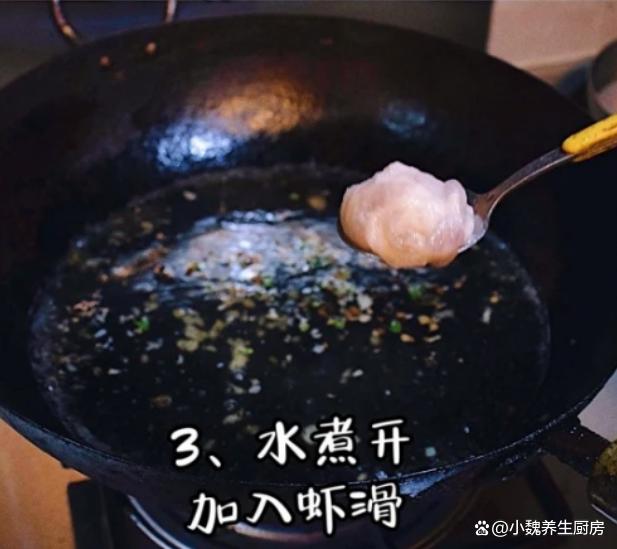 第六步:加上适量清水煮开(也可以用开水再次煮沸),将虾肉挤成虾滑丸子,转到中小火,一次性下入到锅里,让虾滑都浮上来。
