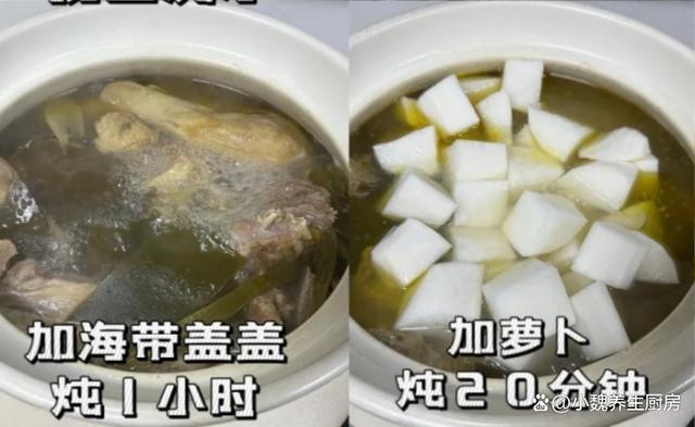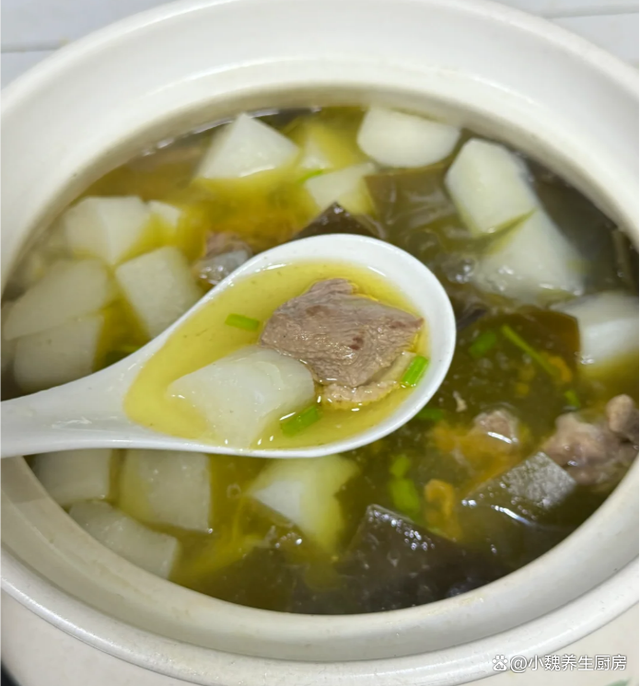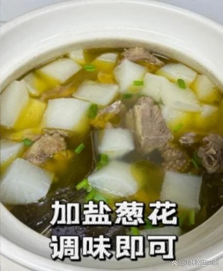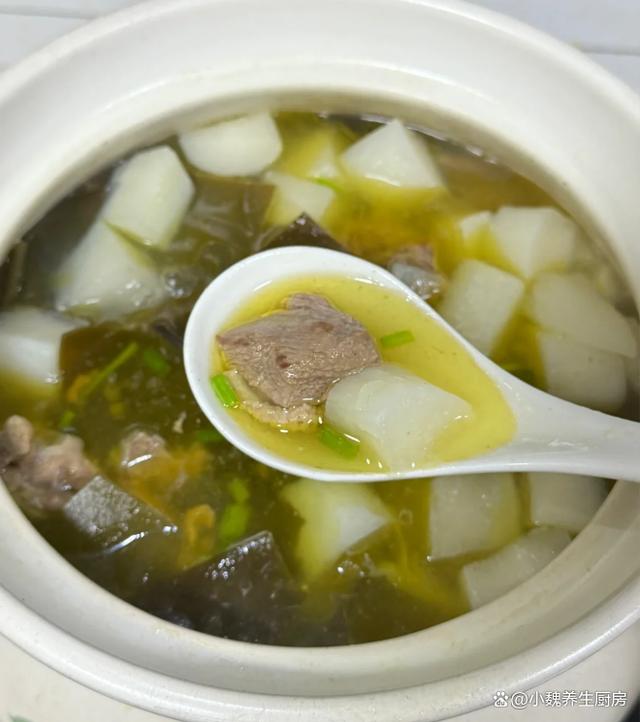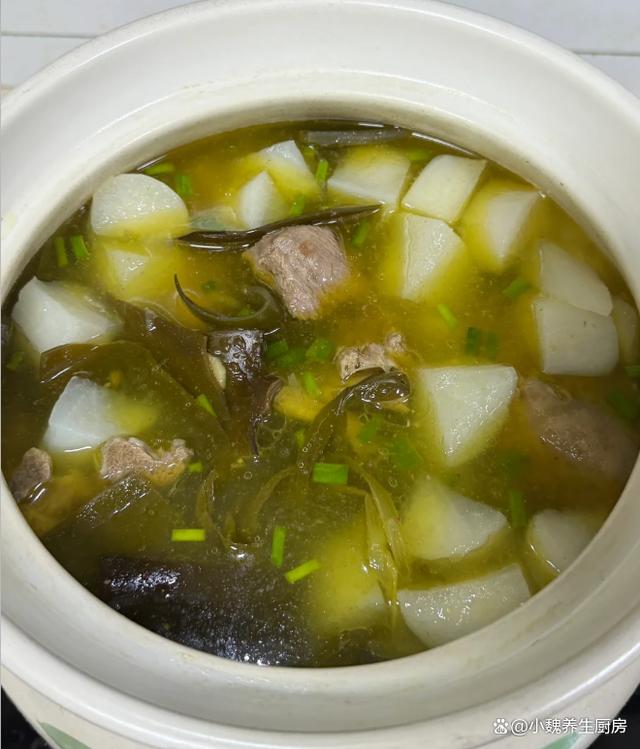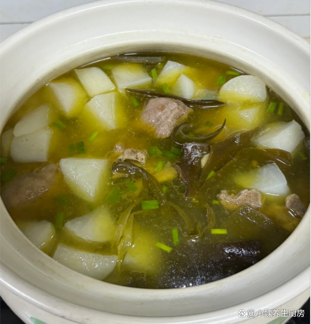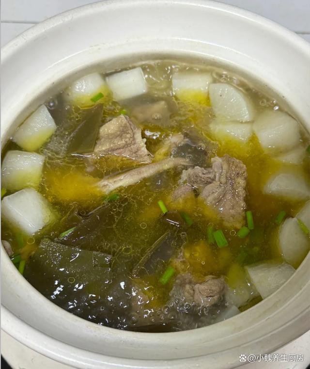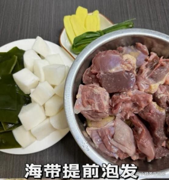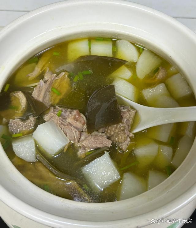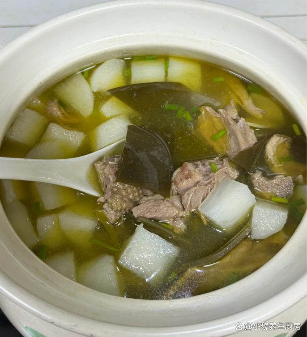 进入寒冬11月,到了月底就更加寒冷,气温一天比一天要寒冷,外面的树木的叶片凋零,一阵阵狂风到来,肌肤都起疙瘩,感觉都着凉了,加上很多地方的早晚温差非常大,让身体体质差,影响我们正常的生活和工作。到了寒冬时节,想要冬天腿脚站得稳,记得要记得适当温补,多喝一些鲜美汤品,让营养更快消化,别错过了。白萝卜是秋冬上市的蔬菜,口感非常清甜,搭配老鸭和海带炖一锅,汤品鲜美极了,对身体很有益处。“冬天喝一汤,腿脚站稳跟”,建议多喝这汤,补足营养,舒服过冬。  【白萝卜海带老鸭汤的正确做法】 准备一些食材:选购干海带20克左右(海带是一种特别受欢迎的藻类蔬菜,有“海中白菜”的美誉,价格便宜,非常容易储存,营养价值非常出色,泡发后可以凉拌,炒食或煮汤,煮汤能够最大化发挥营养价值),一根新鲜的白萝卜(一定要选择外皮光滑,掂一掂水分要足,这样的白萝卜更加清甜,可以做成许多美食),选购新鲜老鸭半只(老鸭又叫水鸭,鸭肉有一定的土腥味,要经过焯水去腥,鸭肉的肉质鲜嫩,可以做成啤酒鸭或炖鸭汤,但是一定不能选择速冻鸭或饲料鸭),生姜一大块,新鲜香葱若干根,冷水和温水少许,少许食用油,胡椒粉少许,一丢丢食盐,其他佐料。