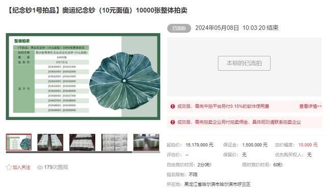 只是如今,奥运钞只剩下1500了,一口气下滑了一半还多。 造成奥运钞崩溃的原因,是在过去一段时间中,有大量整捆的奥运钞,出现在各种拍卖会上。 仅黑龙江的罚没拍卖会,就已经出现超过2万张连号的奥运钞。