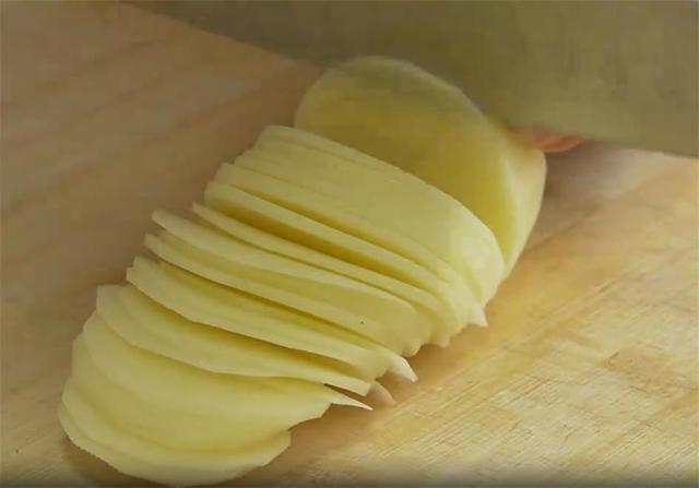 1.大家好,今天用四个小土豆做个好吃的,不用炒也不需要油炸,五分钟上桌,非常开胃的小菜。土豆去皮以后在底部切一刀,这样在切片的时候不容易打滑,切成这种厚度均匀的片,能切多薄就多薄,全部放在凉水里泡着,防止氧化。