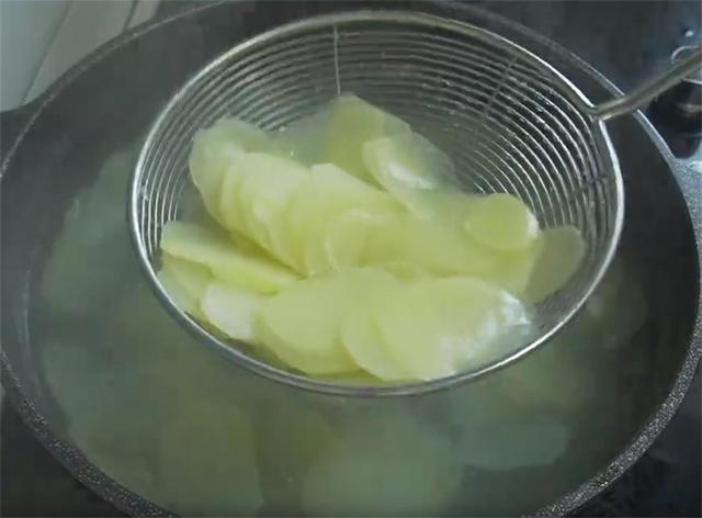 2.锅里水烧开,加一勺盐,把土豆片下锅,时间不要太长,大约两分钟,等土豆片变成这种有点透明的状态就行了,捞出来过一下凉开水,泡凉以后就捞出来,不要一直在里面泡着。