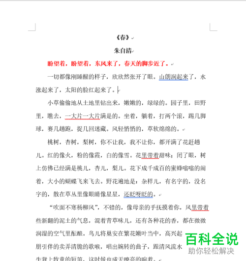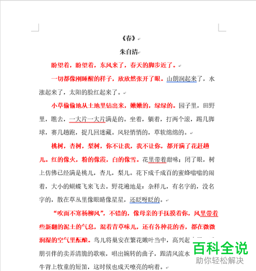 当我们在使用电脑中的word软件处理文字的时候,如果有一些地方需要用到同样的格式的话,可以直接使用格式刷功能,只需要设置一次即可无限次使用,接下来就由小编来告诉大家如何操作。 步骤1. 第一步,打开一个word文档,小编在这里以朱自清先生的《春》为例,我们想要将每一段的第一句话都设置为宋体、小四、红色和加粗字体,则需要选中第一段的第一句话。