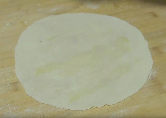 3.取一个面剂,先用手压扁,再用擀面杖擀成薄饼,尽量擀的薄一些,上面刷上一层食用油涂抹均匀。