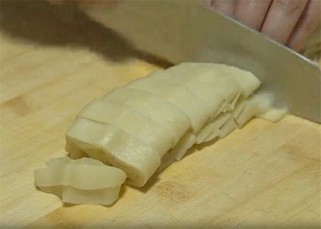 7.面皮放凉以后把每一张都展开,因为表面刷了油,里面都不会粘连,而且每一张都很薄,能清楚的看到手指,这样做好的饼子可以直接拿来卷菜,咱们今天换个吃法,五六张摞在一块卷起来,再切成宽条。