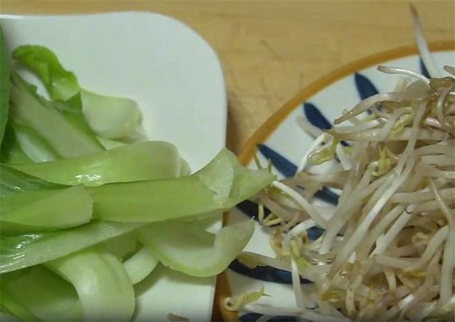 6.准备点自己爱吃的青菜,胡萝卜切成丝,火腿肠切成片,这些是提前洗净的豆芽和油菜。