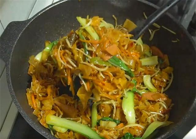 8.锅里油热,下入葱花炒香,加一勺豆瓣酱,再把红油炒出来,下入胡萝卜丝和火腿肠翻炒片刻,再把洗净的绿豆芽下锅,还有切好的面皮,加点生抽、一点老抽上色,孜然粉、适量的盐,继续翻炒一分钟左右,出锅前放上洗净的油菜,再翻炒片刻就可以装盘了。