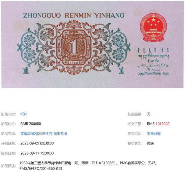 这种被简称为背水1角,被誉为三版币中的币王。 背水1角谁还有?那么如此珍贵的背水1角,能有什么样的表现呢? 在安徽邓通拍卖会中,1张1962年的1角纸币,拍出了101.2万。