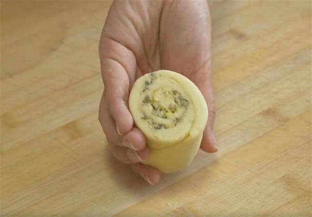 6.然后从一头卷起来,卷紧实一点,再分成大小均匀的段,把每个小剂子整理一下,像这样就可以了。