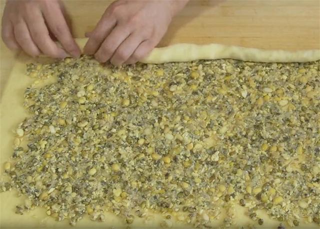 5.案板上撒点干面粉,把发好的面揉一会儿,排一下里面的空气,然后搓成长条,再用手压扁,用擀面杖擀薄,擀成长方形的面片,厚度大约是0.5厘米,再把刚才压好的豆子铺在上面,给它涂抹均匀一些。