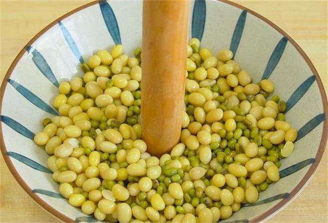 1.大家好,秋冬可以经常吃一些绿豆,今天就用它和黄豆做个好吃的。这些是100克黄豆和60克绿豆,清洗干净,再用温水把它们浸泡4个小时以上,或者提前泡一晚上。