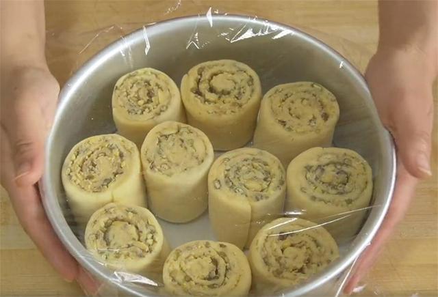 7.准备一个模具,底部和四周都刷上一层油,做好的生胚均匀的摆在里面,盖上保鲜膜二次醒发20分钟。