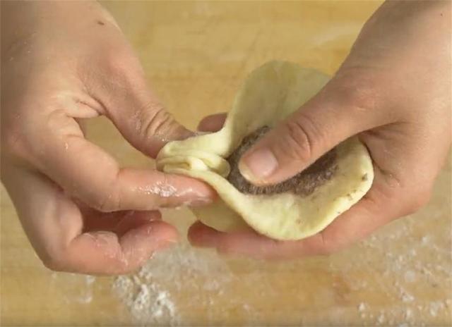 6.再把每个面剂的两头捏起来,捏紧实一些,然后用手压扁,继续用擀面杖擀成圆皮,再放上适量的红糖馅料,用包包子的手法包起来。