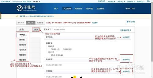 我们的角色设定完毕,看看角色权限,如果你的子账户身兼数职那你就可以在这里设定他的角色权限了。淘宝有原始设定的几个职位,卖家可以根据自家店的情况自行增加或删减。