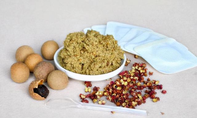 用到的东西就三样,一艾绒二花椒三桂圆肉。桂圆肉、花椒、艾绒按 2:1:1 比例,也可以按照这个剂量,桂圆肉20粒、花椒30克、黄金艾条1根。