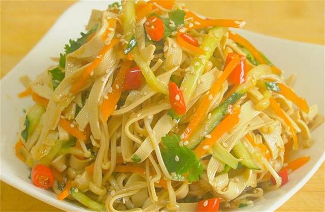 在这个天气干燥的季节,餐桌上怎能少了一道清爽可口的凉拌菜呢?今天,我要给大家推荐一款超好吃的凉拌四丝,这道菜不仅口感丰富,清爽爽口,还能解油腻,开胃又下饭,简直让人欲罢不能,哪怕拿肉来换,我也不愿意哦! 凉拌四丝的主要食材有四种:豆腐皮、胡萝卜、黄瓜和金针菇。豆腐皮滑嫩有弹性,胡萝卜脆甜多汁,黄瓜清新爽口,金针菇鲜美滑嫩,每一种食材都独具特色,搭配在一起更是相得益彰。