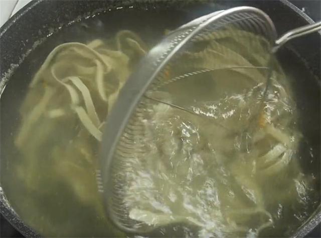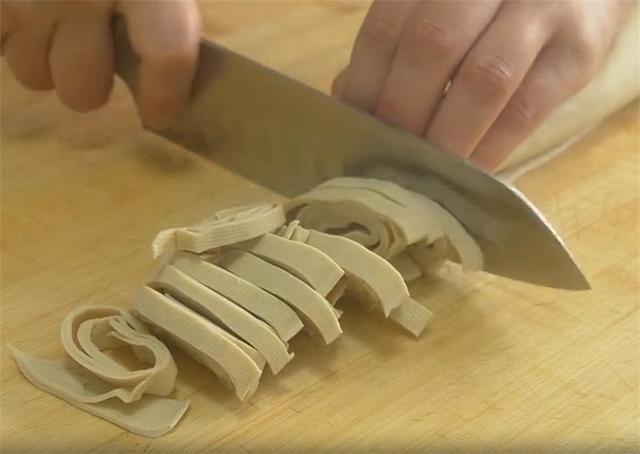 7.再把切好的豆腐皮下锅焯水,大约半分钟就可以去一下豆腥味。