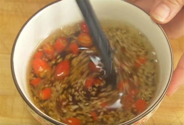 5.再来调个万能的调料汁,大蒜切成末,小米辣剪成段,加一勺白芝麻,烧至冒烟的花椒油浇在上面激发出香味,加一大勺生抽,一勺香醋、一勺味极鲜,一点白糖提鲜,适量的盐、一点香油增香,先搅拌均匀备用。