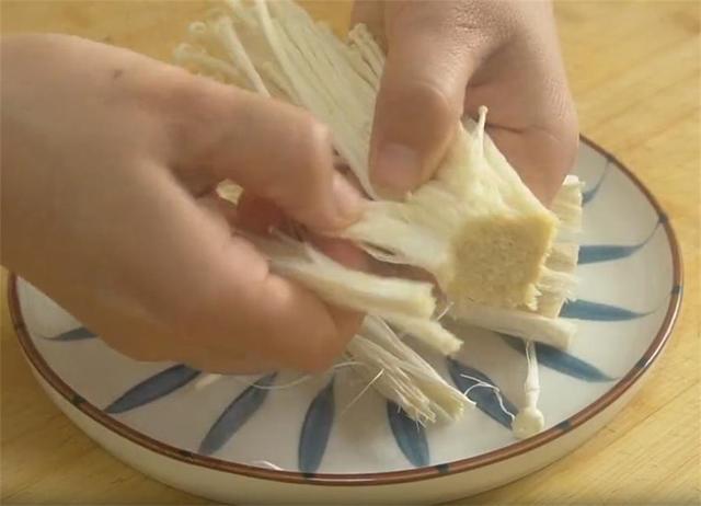 4.一把金针菇把头去掉,用手撕成小朵备用。