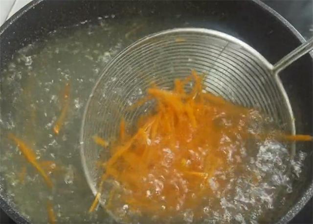 6.锅里水烧开,加几滴食用油,一小勺盐,下入胡萝卜焯水,大约一分钟以后捞出来,过一下凉开水。