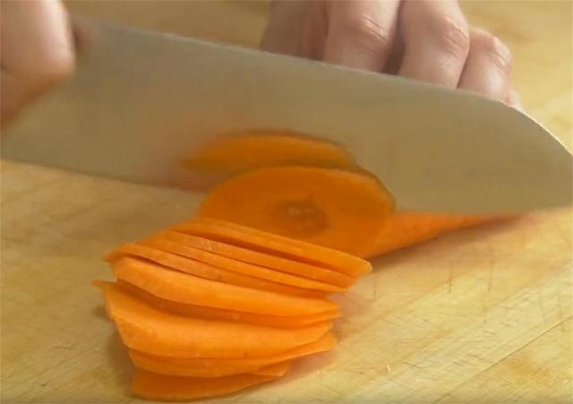 2.胡萝卜切片再切成细丝,想更省事的话,也可以擦网来操作。