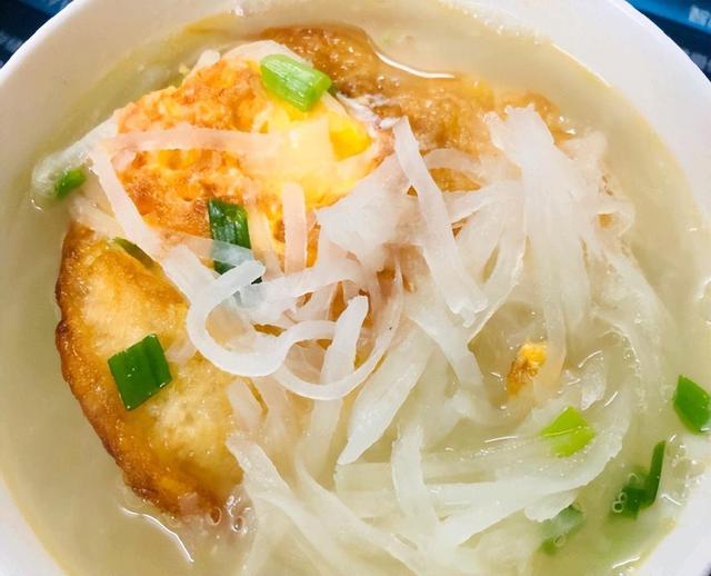锅中加入少许油,打入鸡蛋,煎熟,装出备用。白萝卜洗净擦丝,锅中放入萝卜丝,翻炒至萝卜变软,加入开水没过萝卜丝,放入煎好的鸡蛋。加入适量的盐,白胡椒粉调味,最后撒上一些葱花。