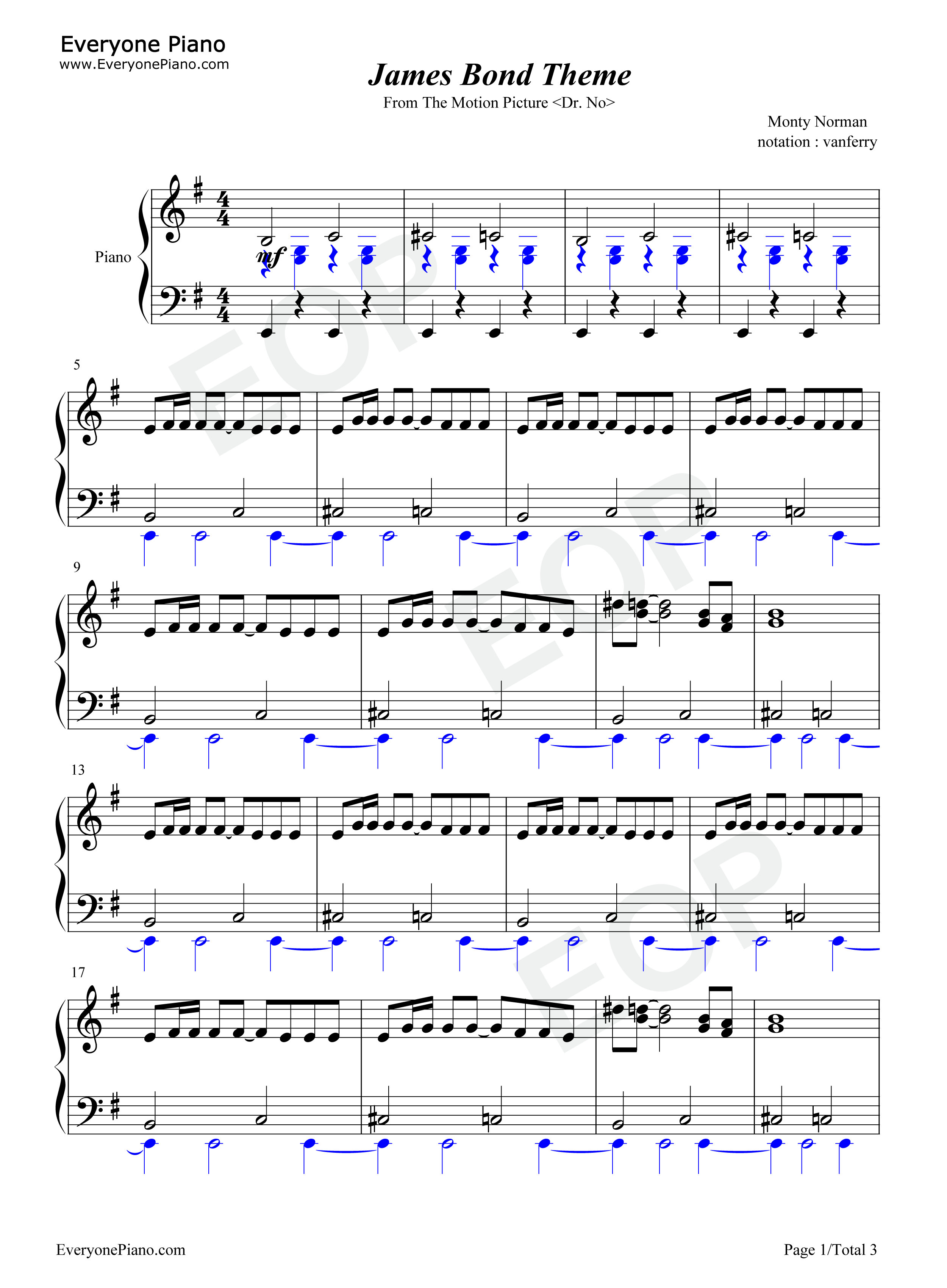 《James Bond Theme》是詹姆斯·邦德007电影系列主题曲之一。出现在007系列电影之《诺博士》(Doctor No)。 《诺博士》:英国电影。本片取材于Ian Fleming的作品,是007电影系列的第一部。故事讲述英国情报特派员詹姆斯·邦德到牙买加侦查凶案,却发现野心家建有核子基地以图不轨,于是他凭着自己的机智将基地加以摧毁的故事。该片于1962年10月5日上映。 该曲是伦敦奥运开幕式女王跳伞版。下方是James Bond Theme钢琴谱,欢迎大家使用。 |
