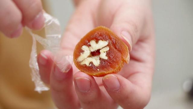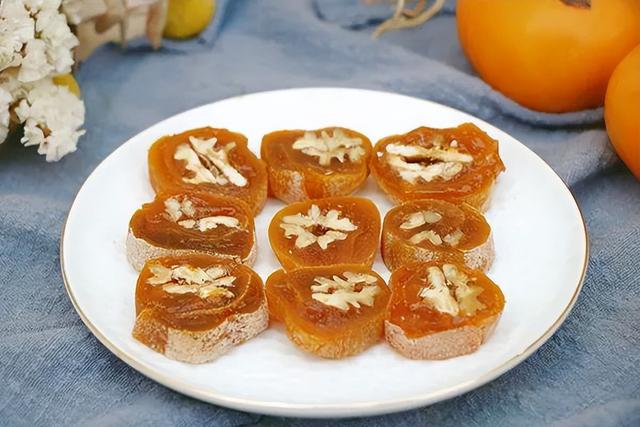 柿饼、核桃 1、柿饼去蒂,从侧面剪开铺平,放上两半核桃仁卷紧 3、切成1厘米左右的厚片即可食用