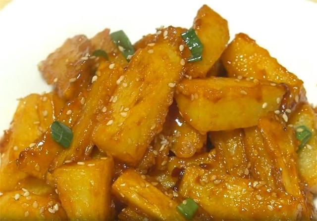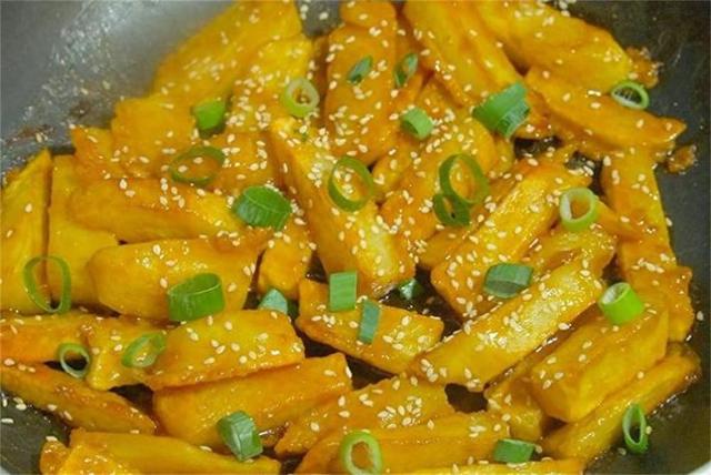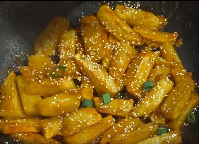6.等汤汁变得粘稠了,就把土豆条下锅,快速地翻拌均匀。最后撒上点熟芝麻和葱花点缀一下,第二种口味就做好了,酸酸甜甜的特别开胃。