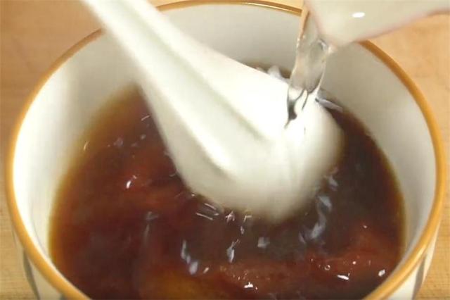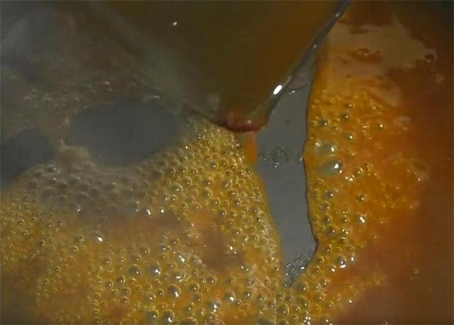 5.然后把料汁倒进锅里,不用放油,用小火慢慢熬,中间要勤搅拌一下,等汤汁变成这种比较粘稠的状态,像这样就行了。