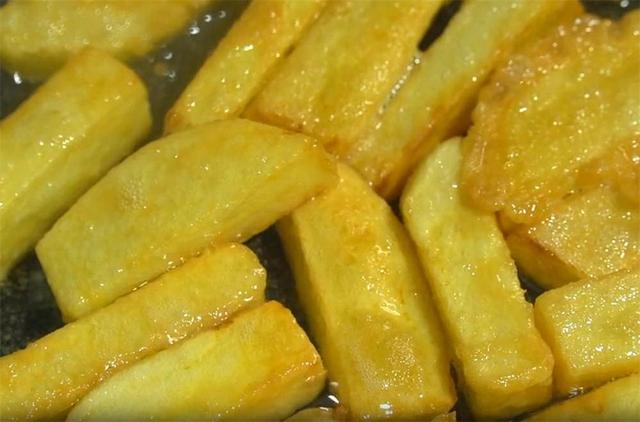 2.接下来,咱们开始煎土豆条。锅里放点油,不用太多,能没过锅底就行。等油温到六成热的时候,把土豆条一块一块地放进锅里。刚开始别急着翻面,等底部煎到金黄色了再翻过来煎另一面。两面都煎到金黄色后,再把这个步骤重复一次,直到土豆条完全煎熟。记得全程都要用小火哦,不然容易煎糊。