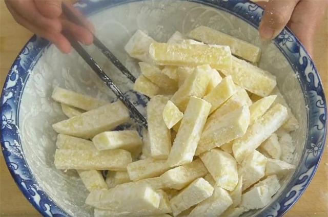 1.大家平时吃土豆,是不是都是炖着吃或者炒成土豆丝呢?今天,我来给大家介绍一个很多人没试过的新吃法,一次就能做出两种口味,绝对让你大开眼界!首先,咱们得把土豆的皮去掉,然后切成厚厚的片,再切成大约三四厘米长的条。切好后,把它们都放进一个大碗里,撒上一大勺淀粉,用筷子搅啊搅,让每个土豆条上都均匀地裹上一层薄薄的淀粉。