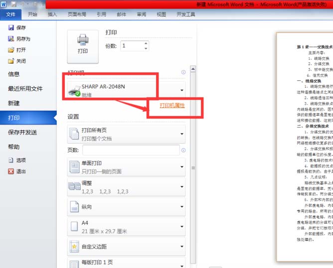 1、首先打开要打印的word文档,点击【文件】→【打印】。打开打印页,选择要使用的打印机后,点击【打印机属性】。