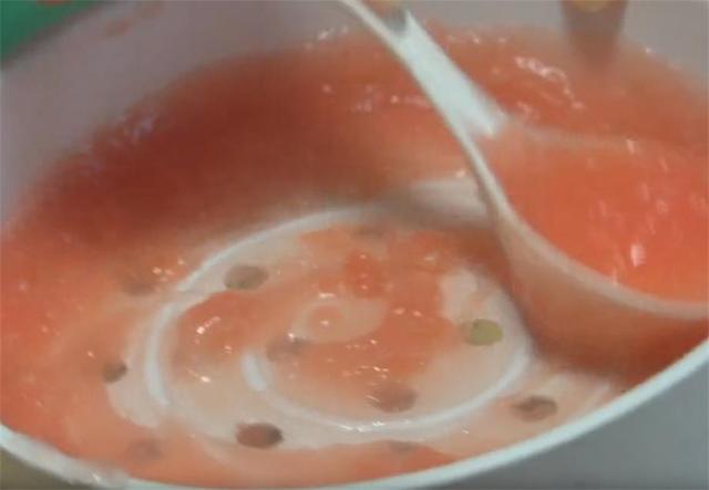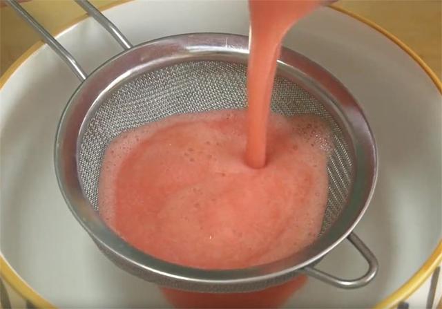 5.准备一盆凉开水,再准备一个大孔的蒸篦,把熬好的西红柿糊分次倒在里面,用一个勺子转着圈按压落在水里,就是一个小虾米的形状,全部做好以后,可以冰箱冷藏2个小时,这样口感更好一些。