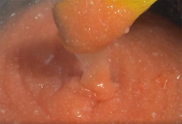 4.锅里加入剩下的西红柿汁和清水共1200毫升,再把调好的西红柿淀粉水倒进去,开小火慢慢熬,中间都要不停的搅拌,这个过程一定不要偷懒,直到最后成这种类似透明的状态就可以了。