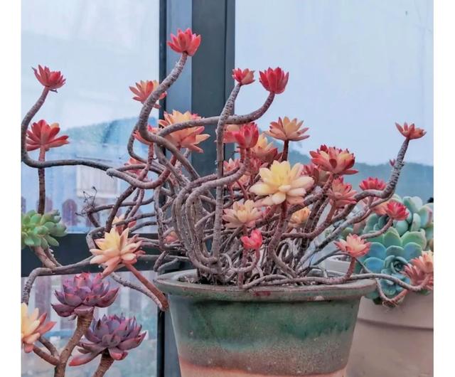 三角梅的花朵由三片苞片组成,形似三角形的叶片,苞片内藏着小巧而精致的花朵,色彩从淡紫到深红,再到纯白,应有尽有,宛如冬日里的一抹娇艳。 三角梅不仅观赏价值极高,还能在寒冷的季节里为人们带来一丝温暖与希望。然而,这位花中皇后却对寒冷异常敏感。 在低温环境下,不能开花,甚至叶片也会枯萎脱落,变成个光杆,所以要早早搬到室内,确保生长温度在16度以上。 多肉植物