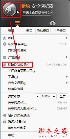 方法二: 1、打开【猎豹浏览器】,点击左上角的“猎豹”图标,在弹出的菜单中点击【清除浏览器数据】;