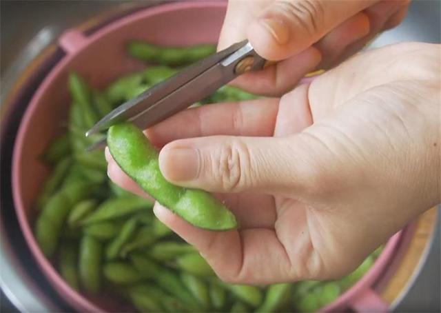 1.大家好,今天分享个毛豆的新吃法,比平时煮毛豆多加一个步骤,颜色翠绿,入味又好吃。这些毛豆正好是四块钱的,在里面加一勺盐,加足量的清水,把它们浸泡五分钟,然后把表面搓洗干净,再用剪刀剪去两头的一点,这样更容易入味。